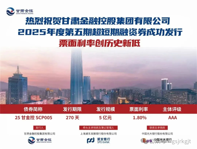 2025年11月17日,甘肅金控集團(tuán)成功發(fā)行2025年度第五期超短期融資券,發(fā)行規(guī)模5億元,期限270天,票面利率1.8%,創(chuàng)下集團(tuán)自開(kāi)展債券融資業(yè)務(wù)以來(lái)所有債券品類(lèi)中的歷史最低利率紀(jì)錄,融資成本管控成效顯著。此次低利率超短期融資券的成功發(fā)行,體現(xiàn)了資本市場(chǎng)對(duì)甘肅金控集團(tuán)經(jīng)營(yíng)實(shí)力、信用資質(zhì)及發(fā)展前景的高度認(rèn)可,為其后續(xù)支持省內(nèi)實(shí)體經(jīng)濟(jì)發(fā)展、深化金融服務(wù)創(chuàng)新、防范化解金融風(fēng)險(xiǎn)等工作提供更充足的資金保障,助力集團(tuán)在服務(wù)全省經(jīng)濟(jì)社會(huì)高質(zhì)量發(fā)展中發(fā)揮更大作用。