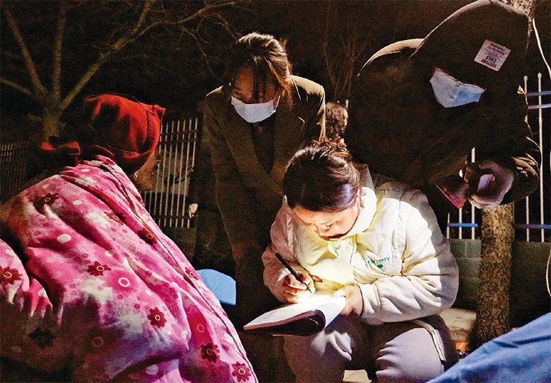 2023年12月19日,在甘肅省積石山縣中西醫(yī)結(jié)合醫(yī)院門口,當(dāng)?shù)馗刹吭诘怯浭転?zāi)群眾信息。18日23時(shí)59分,甘肅省臨夏回族自治州積石山保安族東鄉(xiāng)族撒拉族自治縣發(fā)生6.2級(jí)地震。(新華社記者?馬希平/攝)