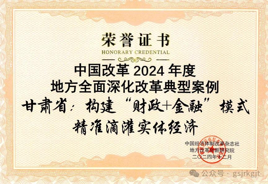 新甘肅客戶端蘭州訊(新甘肅·甘肅日報(bào)記者曹立萍)日前,甘肅省構(gòu)建“財(cái)政+金融”模式精準(zhǔn)滴灌實(shí)體經(jīng)濟(jì)案例入選“中國改革2024年度案例”。這是此次我省入選15個(gè)改革案例中,唯一一個(gè)涉及財(cái)政金融領(lǐng)域的改革案例。