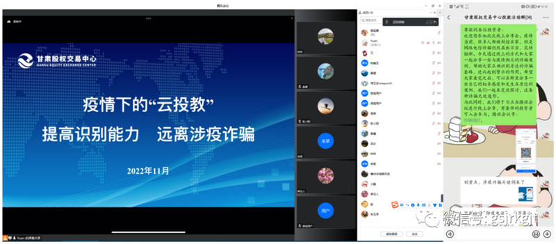 網(wǎng)絡(luò)時(shí)代給我們的生活帶來了極大的便利,但多數(shù)大齡投資者接受與使用網(wǎng)絡(luò)工具的程度較低,風(fēng)險(xiǎn)識(shí)別能力不足,甘肅股權(quán)交易中心按照合格投資者年齡結(jié)構(gòu)及使用偏好通過微信、騰訊會(huì)議等線上交流方式,組織投資者觀看涉疫詐騙視頻及案例。
