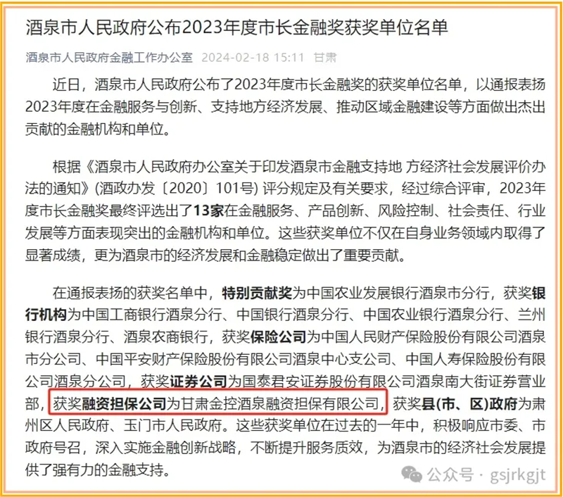 近日,酒泉市人民政府公布了2023年度市長金融獎的獲獎單位名單,通報表揚(yáng)2023年度在金融服務(wù)與創(chuàng)新、支持地方經(jīng)濟(jì)發(fā)展、推動區(qū)域金融建設(shè)等方面做出杰出貢獻(xiàn)的金融機(jī)構(gòu)和單位,甘肅金控酒泉融資擔(dān)保有限公司榮獲酒泉市“2023年度市長金融獎”。
