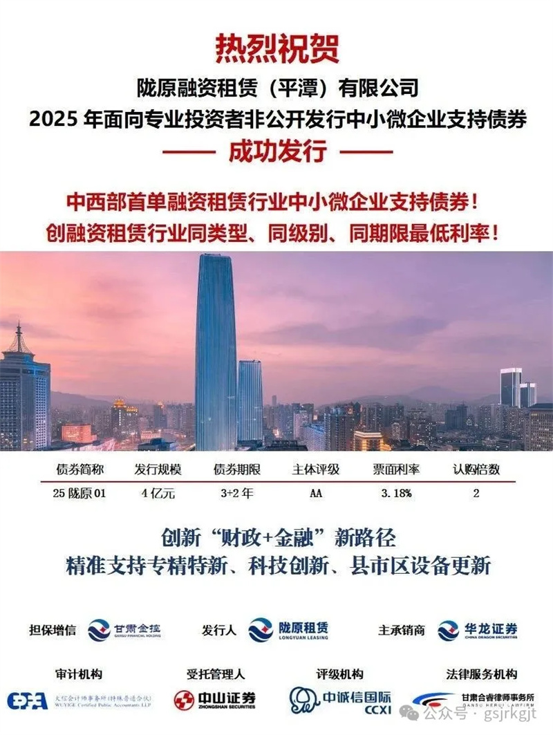 隴原租賃充分依托甘肅金控集團(tuán)“財(cái)政+金融”模式優(yōu)勢,以財(cái)政政策引導(dǎo)、金融服務(wù)協(xié)同、投融資聯(lián)動(dòng)等方式,吸引資本市場資金全力支持我省實(shí)體經(jīng)濟(jì)。7月28日,隴原租賃在上交所成功發(fā)行中小微企業(yè)支持債券,規(guī)模4億元,期限3+2年,票面利率3.18%,認(rèn)購倍數(shù)2倍,是中西部省份首單融資租賃行業(yè)中小微企業(yè)支持債券,創(chuàng)融資租賃行業(yè)同類型、同級(jí)別、同期限歷史最低利率。